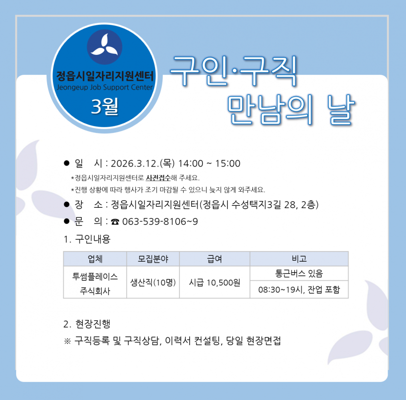 장소 : 정읍시일자리지원센터 (정읍시 수성택지3길 28, 2층) 컨벤션룸